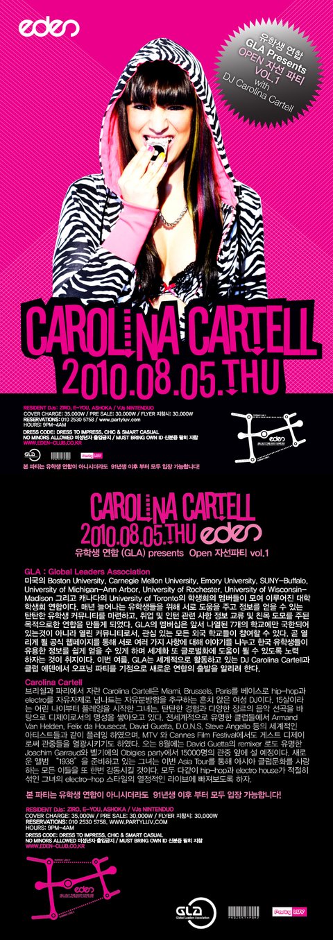 브리쉘과 파리에서 자란 Carolina Cartell은 Miami, Brussels, Paris를 베이스로 hip-hop과 electro를 자유자제로 넘나드는 자유분방함을 추구하는 흔치 않은 여성 DJ이다. 15살이라는 어린 나이부터 플레잉을 시작한 그녀는, 탄탄한 경험과 다양한 장르의 음악 선곡을 바탕으로 디제이로서의 명성을 쌓아오고 있다. 특히, Carolina Cartell의 첫 번째 리믹스는 Felix Da Housecat이 주최한 리믹스 콘테스트 Top 15에 오르기도 하였으며, Bob Sinclar와 함께 세계적인 프로듀서 Cutee B의 featuring을 통한 single “My Pussy”으로 아티스트로써의 입지를 더욱더 굳히고 있다. 전세계적으로 유명한 클럽들에서Armand Van Helden, Felix da Housecat, David Guetta, D.O.N.S, Steve Angello 등의 세계적인 아티스트들과 같이 플레잉 하였으며, MTV 와 Cannes Film Festival에서도 게스트 디제이로써 관중들을 열광시키기도 하였다. 또한 오는 8월에는 David Guetta의 remixer 로도 유명한 Joachim Garraud와 벨기에의 Obigies party에서 15000명의 관중 앞에 설 예정이다. 새로운 앨범 “1938”을 준비하고 있는 그녀는 서울, 마카오 등을 기점으로 한 이번 Asia Tour를 통해 아시아 클럽문화를 사랑하는 모든 이들을 또 한번 감동시킬 것이다. 모두 다같이 hip-hop과 electro house가 적절히 섞인 그녀의 electro-hop 스타일의 열정적인 라이브에 빠져보도록 하자.