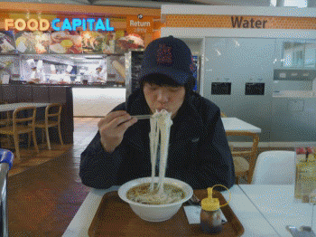 부랴부랴 인천공항에서 야식을 때우는 母子..