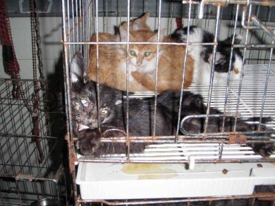 한 케이지 안에...죽은 고양이와 아기고양이가 함께 있습니다..