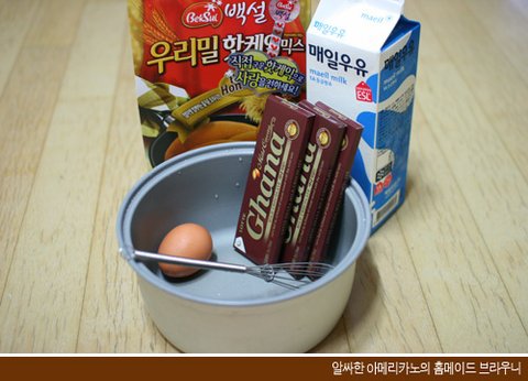 핫케익믹스, 우유, 계란1개, 초콜렛3개, 밥통, 거품기