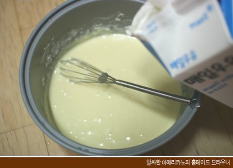 걸쭉해서 젓기가 힘들 정도까지만 우유를 부어 줍니다.