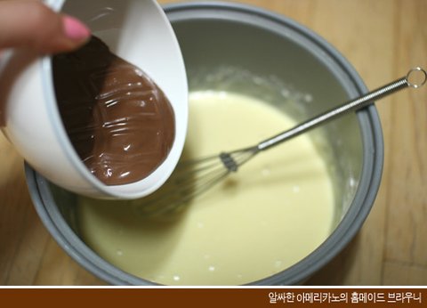 잘 녹인 초콜릿을 미리 만들어둔 반죽에 넣습니다.