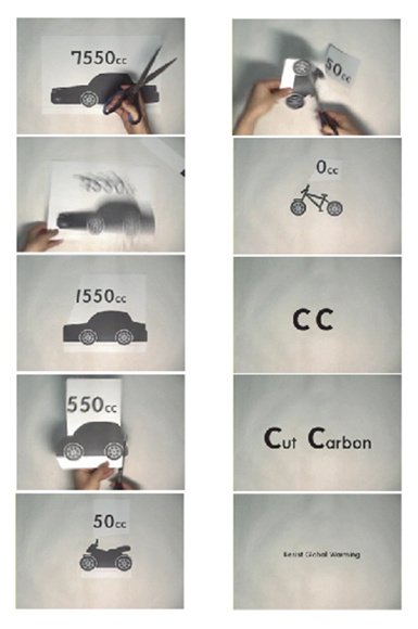 내용: 큰 자동차 그림에서 가위질을 하면 할수록 점점 작아져서 마지막에 자전거가 됩니다. 이와 동시에 배기량을 뜻하는 cc의 수치가 점점 낮아지며 나중에는 0cc가 됩니다. 이때 배기량수치를 뜻하는 cc가 Cut Carbon이라는 카피로 변하면서 탄소를 줄이자는 뜻을 내포한 “탄소를 잘라라!”라는 메시지를 전하게 됩니다.