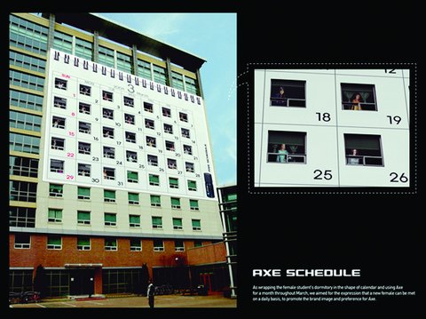 내용: 타깃을 대학생으로 선정하여 AXE의 브랜드 이미지 향상을 위해 대학생들이 자주 다니는 여자기숙사를 매체 장소로 선택하였다. AXE는 남성용 향수로 사용하면 여자가 끌려진다는 섹슈얼적인 컨셉을 내세우는 브랜드이다. 그래서 여자 기숙사 건물을 달력모양으로 랩핑하여 한달동안 집행하였으며, AXE를 사용하면 날마다 새로운 여자들을 만날 수 있다는 것을 표현, 액스의 브랜드 이미지와 선호도를 높이게 하였다.