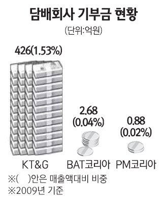 426억원. 지난해 KT&G의 기부액이다. 외국계 담배회사들은 기부금을 얼마나 냈을까. BAT코리아는 2억6,794만원, 필립모리스코리아는 8,843만원을 냈다. '마일드 세븐'을 파는 일본계 담배회사는 아예 한푼도 내지 않았다. 매출이 KT&G의 7~21.6%에 이르는 외국계 담배사들이 만약 기부금을 KT&G 수준에 맞췄다면 187억원을 냈어야 하지만 실적은 3억5,637만원에 그쳤다.