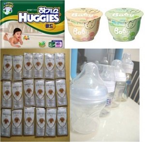 아이 기저귀와 분유, 젖병, 그리고 아이 이유식 겸 간식 떠먹는 불가리스 베이비.