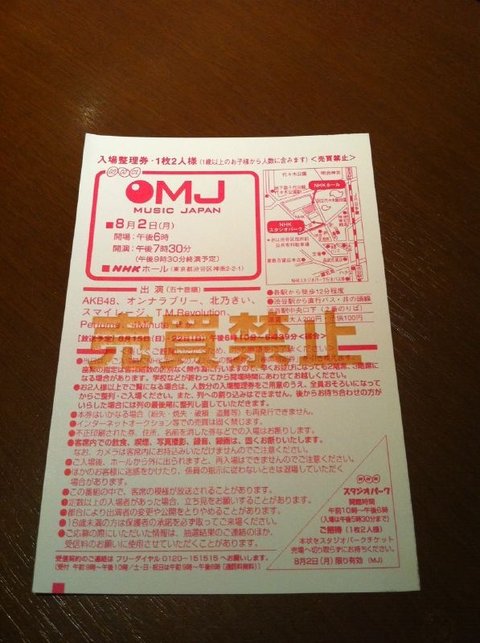 일본에 온다는 뉴스기사(한국)를 본 순간、혹시 MUSIC JAPAN에 출연하는게 아닌가 하는 생각이 들어、관람을 신청했습니다。하지만 출연자가、AKB48、Perfume처럼 일본을 대표하는 아이돌그룹이라서、당시의 경쟁율이 상당히 높았던 것으로 기억합니다。