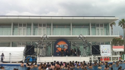 KARA가 공연하는 무대는、무대앞이 수영장이라、수영을 하면서 공연을 볼 수 있는 곳이였습니다。