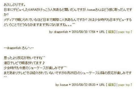 블로그 주인장님、안녕하세요。항상 좋은 블로그 올려주셔서 감사드립니다。KARA가 일본에서 데뷔한、싱글 판매량이 5위더군요。해외 여성 그룹의 데뷔 싱글 판매량이 5위안에 든 것은(10위 이내인가?)놀란즈 이후 처음이라고 하네요…팬의 한 사람으로서 너무 기쁩니다。카라가 한국으로 돌아가、TV에서 볼 기회가 적어진게、무척 허전하지만、신곡이 가을쯤에 발표예정이라고 하니、그때 다시 일본에 와주었으면 합니다。한국의 여러 여성그룹들이 계속 일본에서 데뷔한다고 하지만、저는 앞으로도「KARA」를 응원할 생각입니다。