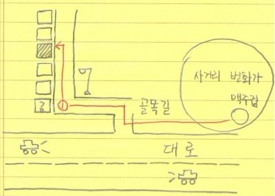 대충 이런경로로 기어가고 있었음. 좌측상단 빗금이 본인 서식지이며 물음표 표시