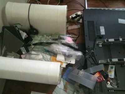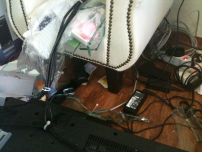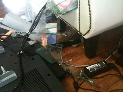 TV밑에 있던 강화유리로 된 테이블이 산산조각나면서 화장품들이 다 깨졌고 제가 쓰던 노트북이 TV 모서리에 깔려있습니다.
