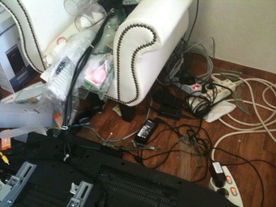 저 4개의 못에 조그만 사각 철 구조물을 걸고 거기에 20kg가 족히 넘어보는 TV를 그냥 걸어두는데 괜찮을 리가 있나요.