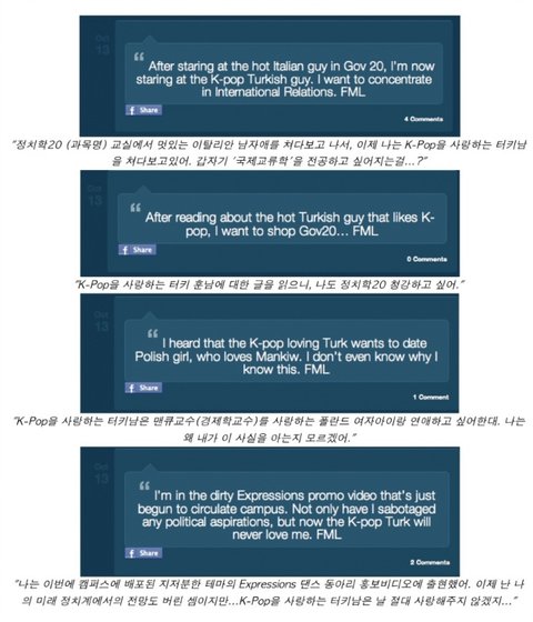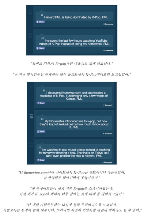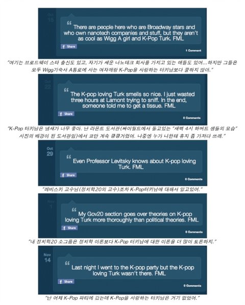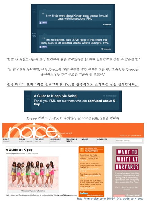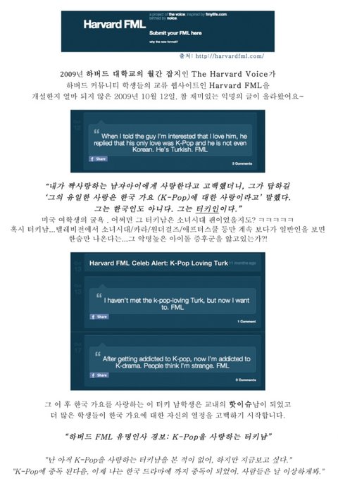 음...웃대의 웃긴 자료나 네이트 판의 개념이지만, 150자 내외의 길이라고 생각하시면 되려나? 아무튼 하버드의 FML사이트에 한류열풍을 실감할 수 있는 재미있는 글이 올라왔습니다!