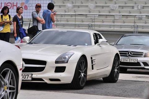 벤츠의 신형 SLS입니다. 진짜 걸윙(위로 열리는)타입의 도어를 장착했고, 최근 미하엘 슈마허가 터널에서 벽을 타고 도는 영상으로 관심을 끌었던 바로 그 차입니다. 이날 두 대 정도를 본 것 같습니다. 흰색과 무광 컬러…