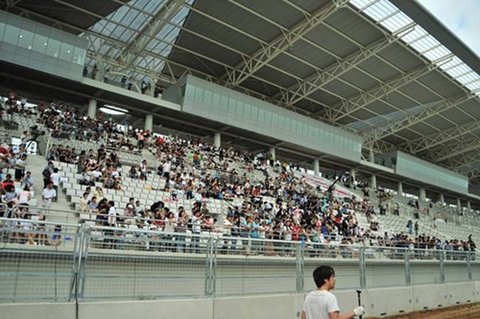 아직 완성되지 않은 스탠드이지만, 이날 행사를 위해서 관중석의자를 부분적으로 설치했습니다. 덕분에 관람은 큰 불편이 없었고요. 다만 앞 부분에 앉은 분들은 높은 천정 덕분에 비를 제대로 피할 수 없었습니다. 갑작스레 내리는 소나기에 다들 잠시 자리를 피했을 때의 사진 입니다.