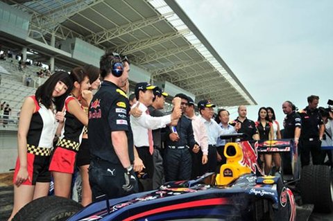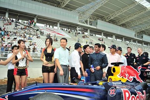 직선 구간을 미친듯한 굉음과 함께 달려나가는 레드불 F1머신 드라이버는 인도출생의 ‘카룬찬독’입니다. HRT팀 소속이지만 팀의 내부 ‘계약문제’로 올 시즌 4경기를 쉬게 되어 참석하게 되었습니다. 현역 F1드라이버의 포스라니!!