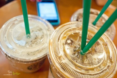 넷이서 벤티 하나, 그란데 둘을 주문했어욤~ 저는 사랑하는 카라멜 마끼야또 ㅎㅎㅎ
