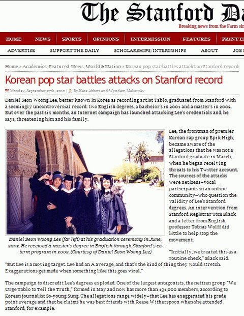 타블로가 스탠포드에 다니지도, 졸업하지도 않았다고 말하는 사람에게 한방 날리는 기사이네.