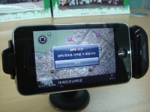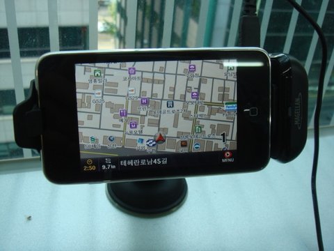 아이팟터치(3세대)를 Mio GPS Car Kit을 이용하여 내비게이션으로 사용하는 모습입니다.