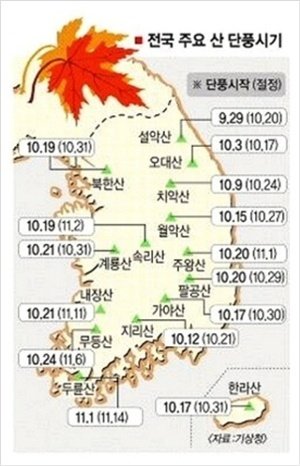 올 해 단풍은 10월 20일쯤이 절정이라고 하던데 중남부 지방에는