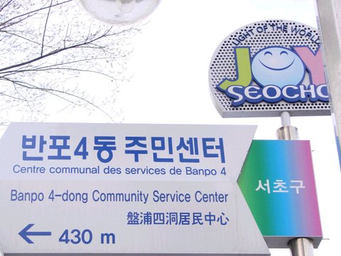 서초구의 한 주민센터 표지판이군요. 서초구의 영문표기(SEOCHO) 엠블렘이 눈에 띄는군요.