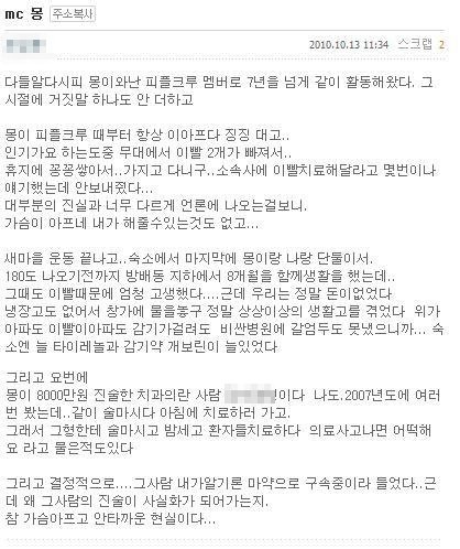 MC몽이 아파서 늘 징징되고 무대서 이빨 2개 빠지기도 했다고 하네요 ㅎㄷㄷ