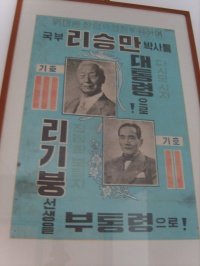 희귀 전시품이 두 점이 있었는데요, 하나는 우리나라에 한 장만 남아있는 제 1 공화국 시기 대통령/부통령 선거 포스터입니다. 이곳에 전시된 50년대 선거 자료를 보면, 후보들의 기호가 아라비아 숫자가 아닌 막대 개수로 표기되어 있는 걸 볼 수 있습니다. 당시에 문맹률이 높아서 선택한 방법이라네요. 국회의원의 경우 스무 명, 서른 명이 선거에 나왔을 때도 있다는 데 인쇄하기가 만만치 않았을 것 같습니다.
