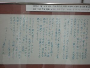 다른 하나는 1961년 쿠테타를 일으키기 직전 박정희 소장이 장도영 참모총장에게 보낸 친필 편지입니다. 원본 외 남아있는 두 개의 복사본 중 하나가 이곳에 있습니다. 역사적 가치가 높은 사료라 주의깊게 봤습니다. 이 글을 보며 편지를 써내려갔을 박정희 소장과 이를 읽었을 장도영 참모총장은 무슨 생각을 했을까 궁금했습니다. 역사에 어떤 파장을 미칠지 생각은 했을까요?