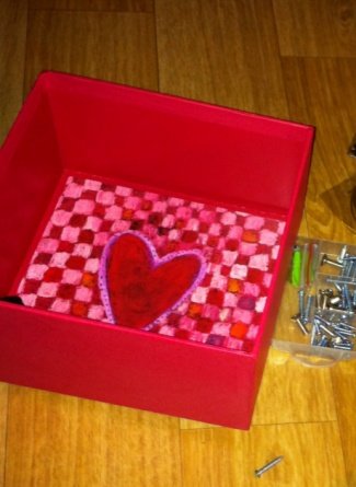 1. 상자벽면에 편지지 그림을 붙이고, 구멍을 뚫어 오르골을 고정시킨다.