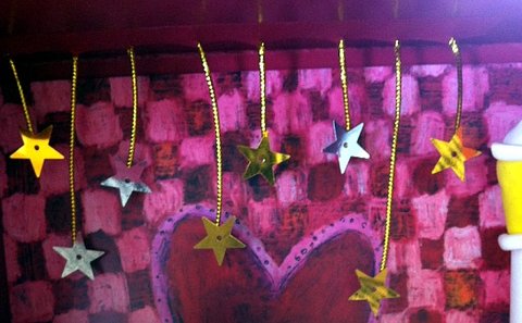 저렇게 금줄에 별을 붙이시고 상자색과 같은 종이에 구멍을 뚫어 접착시킨다음 천장에 풀로 붙이면 됩니다 ㅋ