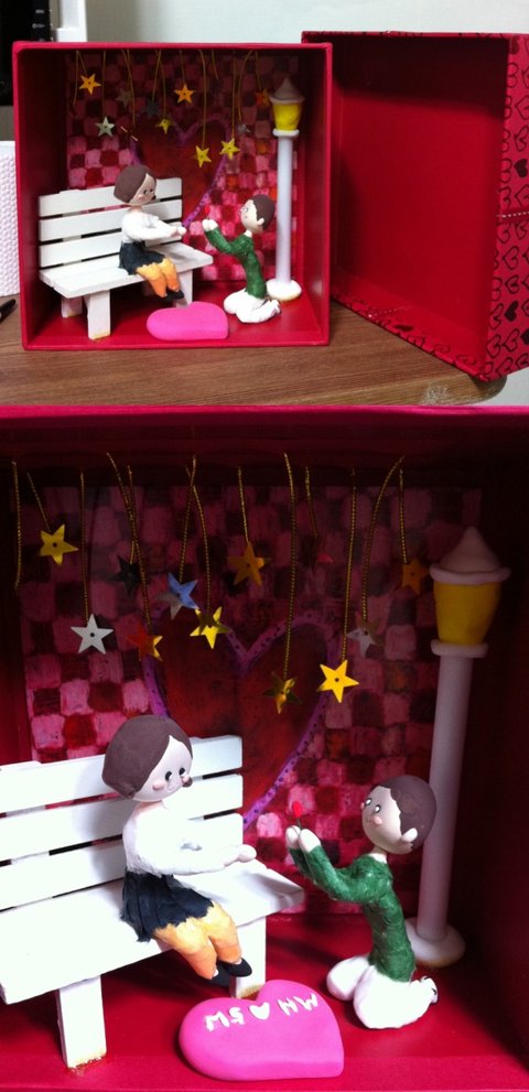 준비물 : 종이상자, 편지지, 오르골, 모형의자, 아이클레이, 한지색종이, 별장식, 장식용 금줄, 수수깡, 철사, 오공본드, 목공용풀 or 딱풀