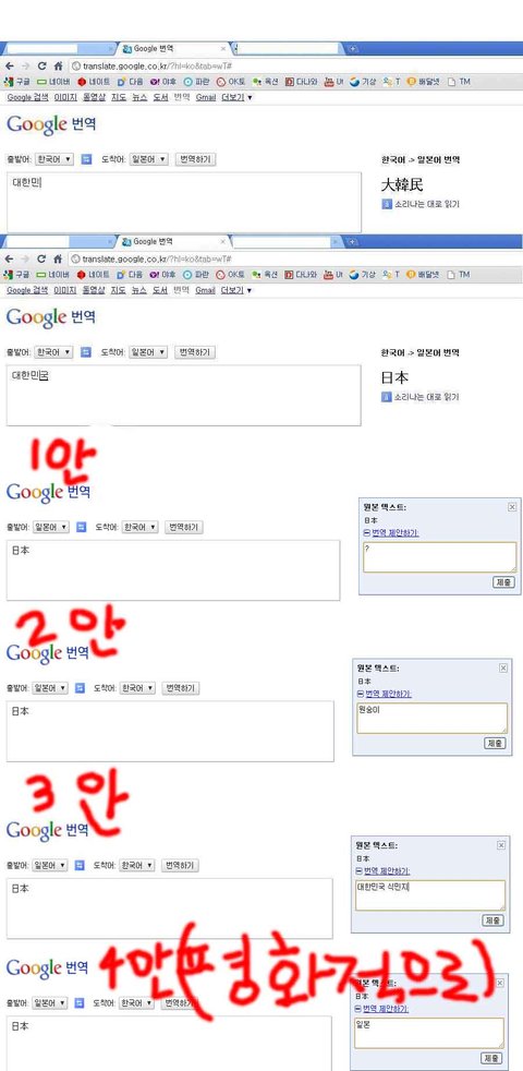구글 번역에 들어가서 '대한민국'을 일본어로 번역하면 아래와같이 일본 한자로 나옵니다.정말 기분나빠서....