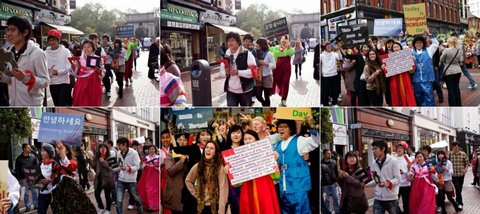 일단은 한글을 설명한 판넬과 한글의 자음,모음 모양을 들고 다니며 퍼레이드를 했어요!! 생각보다 반응이 엄청 뜨거웠어요~ 지나가던 외국인들의 눈길을 확 사로잡았더랬지요