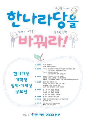 그리고, 한나라당 정책마케팅 공모전이 있네요. 이런저런 일이 바빠서 이건 넘어가자 싶었는데 기간이 11월 3일까지로 한주 연장됐다고 해서 해보려고 해요. 요즘 다들 취업문제 때문에라도 정치 사회면은 챙겨보잖아요. 저도 요즘 열심히 챙겨 보려고 노력중인데요. 이건 바꿨으면 하는 정책이랑 마케팅 전략에 대한 공모전이라 더 흥미 있는 것 같아요. 바꿨으면 하는 정책에 대해 정리하다가 분노의 공모전 준비가 될 수 도 있을 것 같다는...;;; 게다가 1등만 되면 한 학기 등록금이...ㅎㄷㄷ 자기가 생각하는 거 마음껏 표출해 보자구요.ㅋㅋ