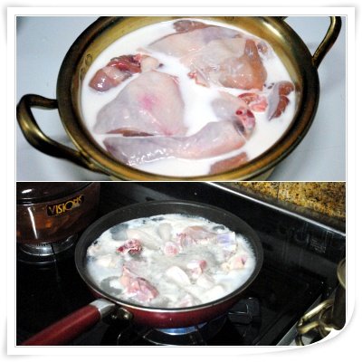 닭은 먼저 우유에 20분간 재운뒤..끓는물에 살짝 데쳐주고 헹군다음에