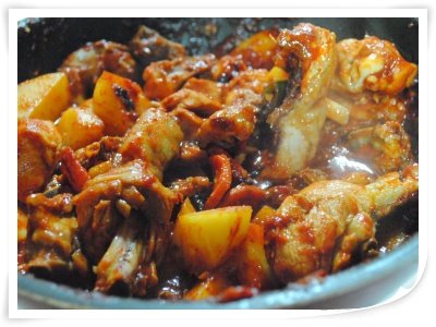 다음은 데친 닭에 양념을 버무리고 야채와 함께 넣어 푹 쫄였음!!