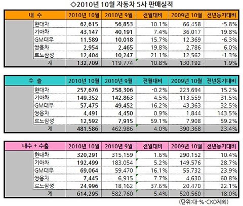 다음 표는 2010년 10월 자동차 5사의 판매실적입니다.