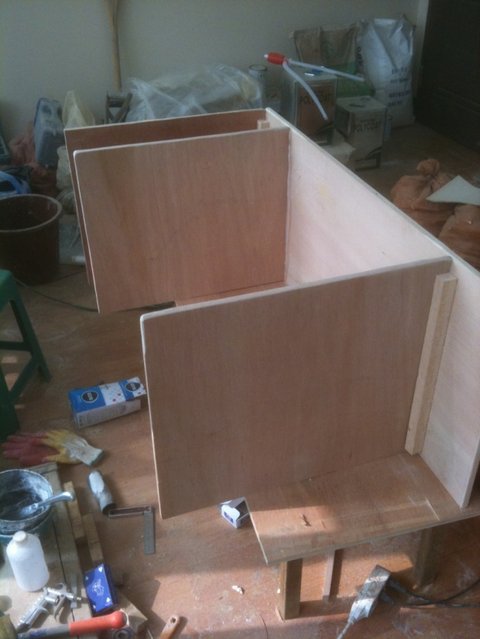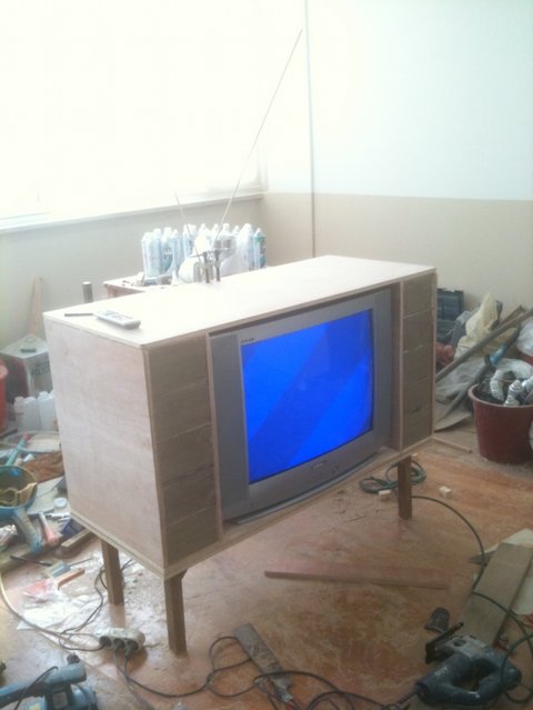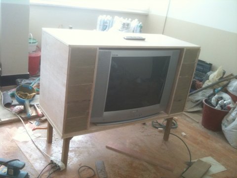 합판으로.. TV를 넣을 박스를 짭니다. 역시, 재단 후.. 오공본드 바르고.. 에어타카로 "타카타카타카~"