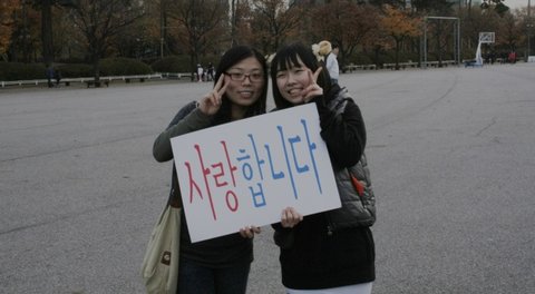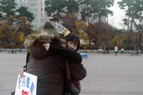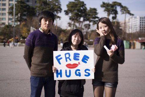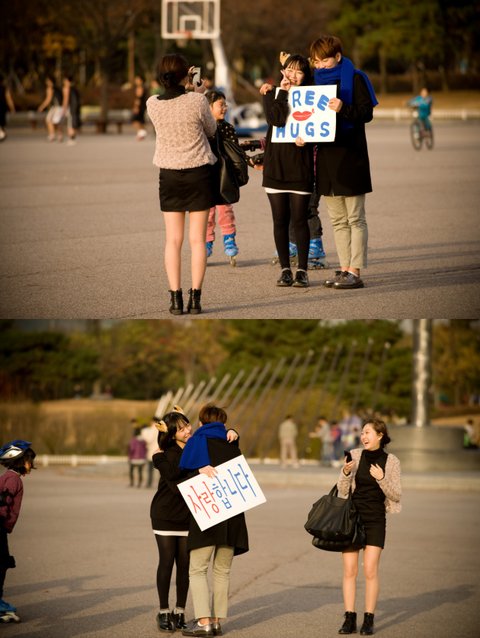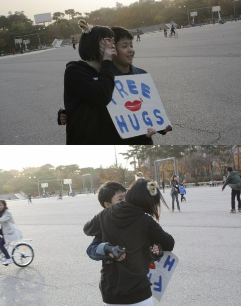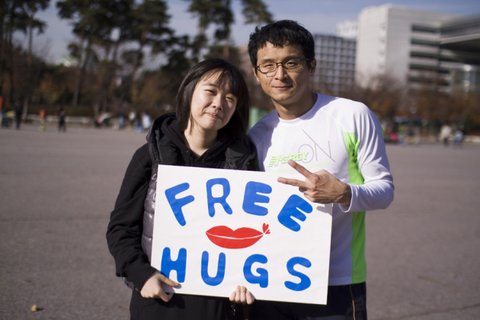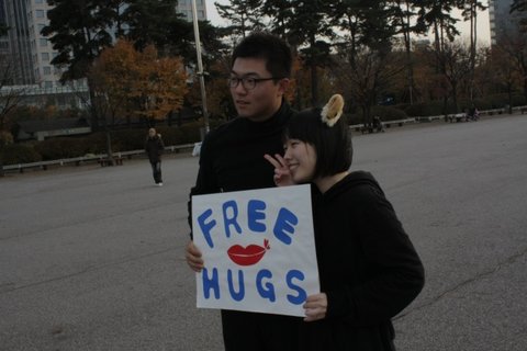 명동, 홍대, 인사동, 여의도에서 오후 2시부터 5시까지 두명씩 프리허그를 섰습니다.