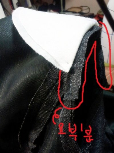 마무리 작업. 어깨뽕과 함께 어깨선에 바이어스방향으로 짜른 원단을 덧 대줌으로서