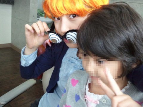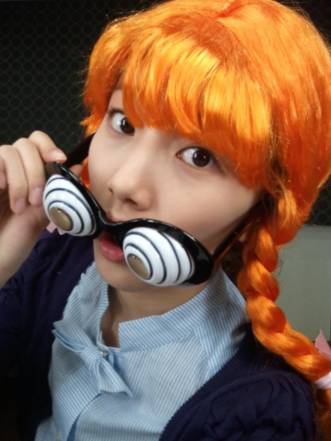 주황색 삐삐머리 가발에 뺑뺑이 안경을 쓰고 깜짝 놀란 표정을 짓고있는 수지양