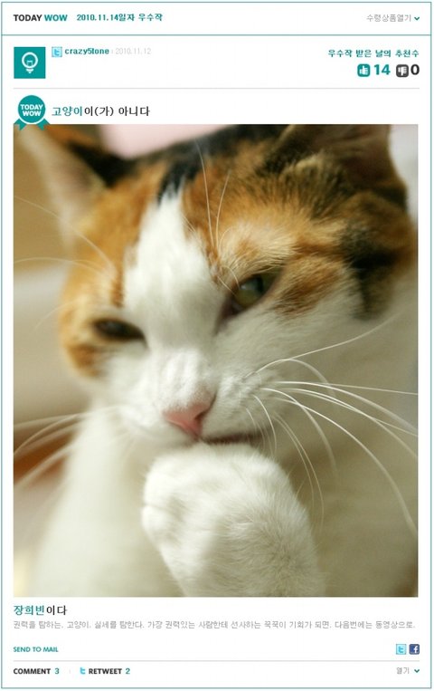 귀엽고도 요염한 고양이 사진으로 우수작이 되셨구요!