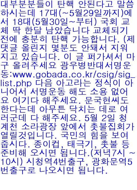 ps. 대부분분들이 탄핵 안된다고 말씀하시는데 17대(~5월29일까지)에서 18대(5월30일~부터) 국회 교체 딱 한달 남았습니다 교체돼기전에 충분히 탄핵 가능합니다. (제 댓글 올린지 몇분도 안돼서 지워지고 있습니다. 이 글 퍼가셔서 마구 올려주세요)