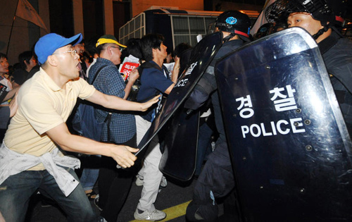 가만히 있는 전경들 방패뺃으려는 평화시위대