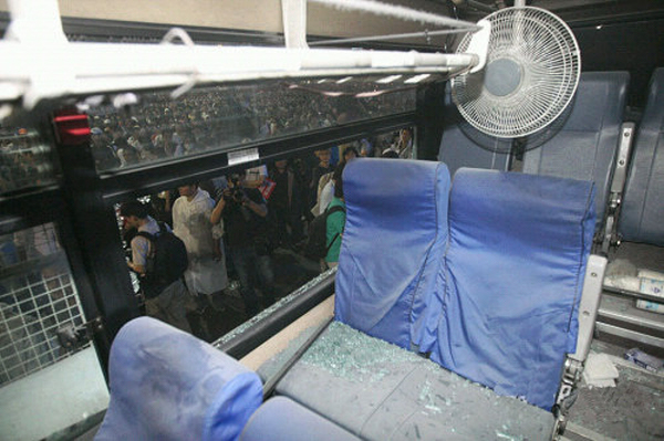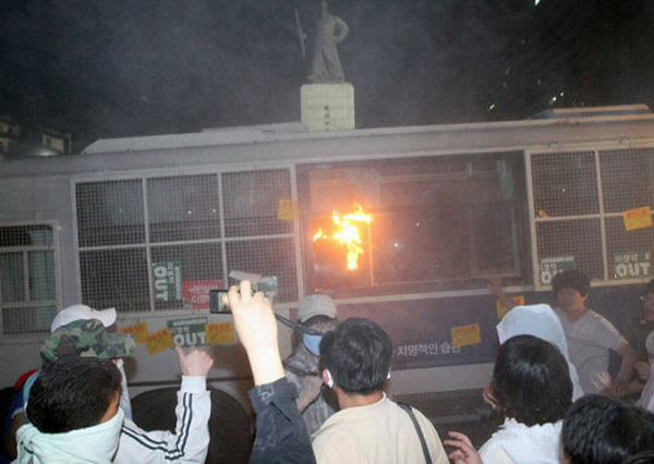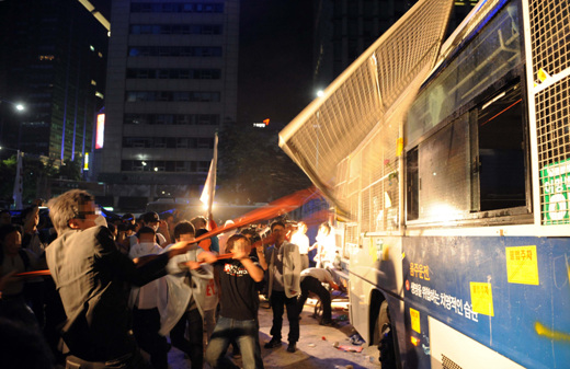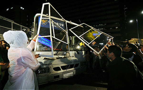 평화시위대들이 전경버스 유리창 뜯어내는 사진