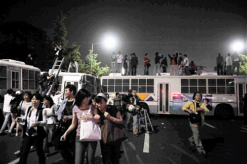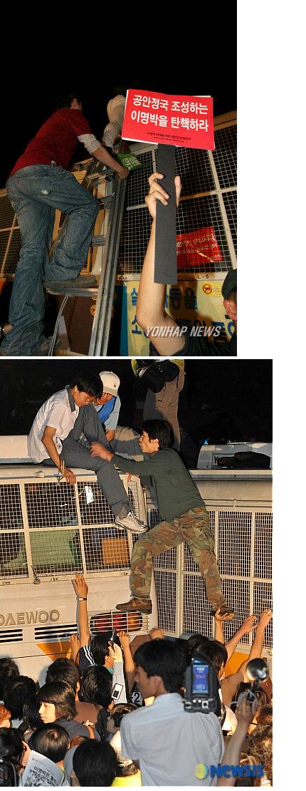 평화시위대들이 전경버스위에 올라가 있는 사진