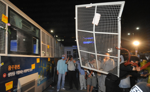 전경버스 철망 뜯어내는 평화시위대들