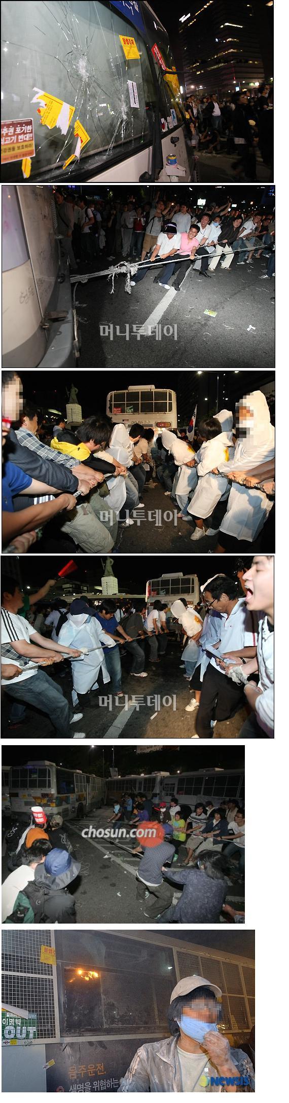 평화시위대들에 의해 처참히 부서지고 끌려가는 전경버스