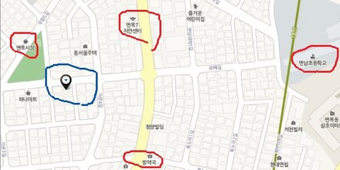빨간색으로 ○표 친게 대략 큰건물이거나 동네사람들이 알만한곳이구요!
