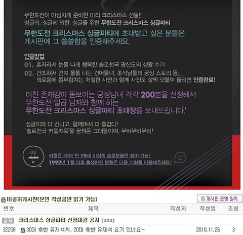 그런데 이번에 주변에서 추천해줘서 무한도전 크리스마스 싱글파티 신청하였습니다. 히힛